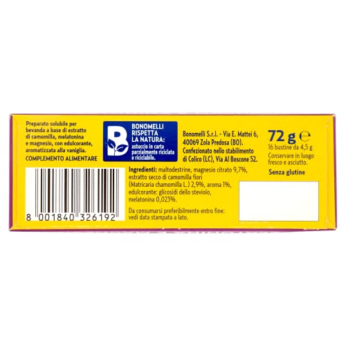Bonomelli Camomilla Solubile con Melatonina e Magnesio 16 Bustine, Contro Stanchezza e Affaticamento, Infuso Rilassante, Senza Zucchero (72g)
